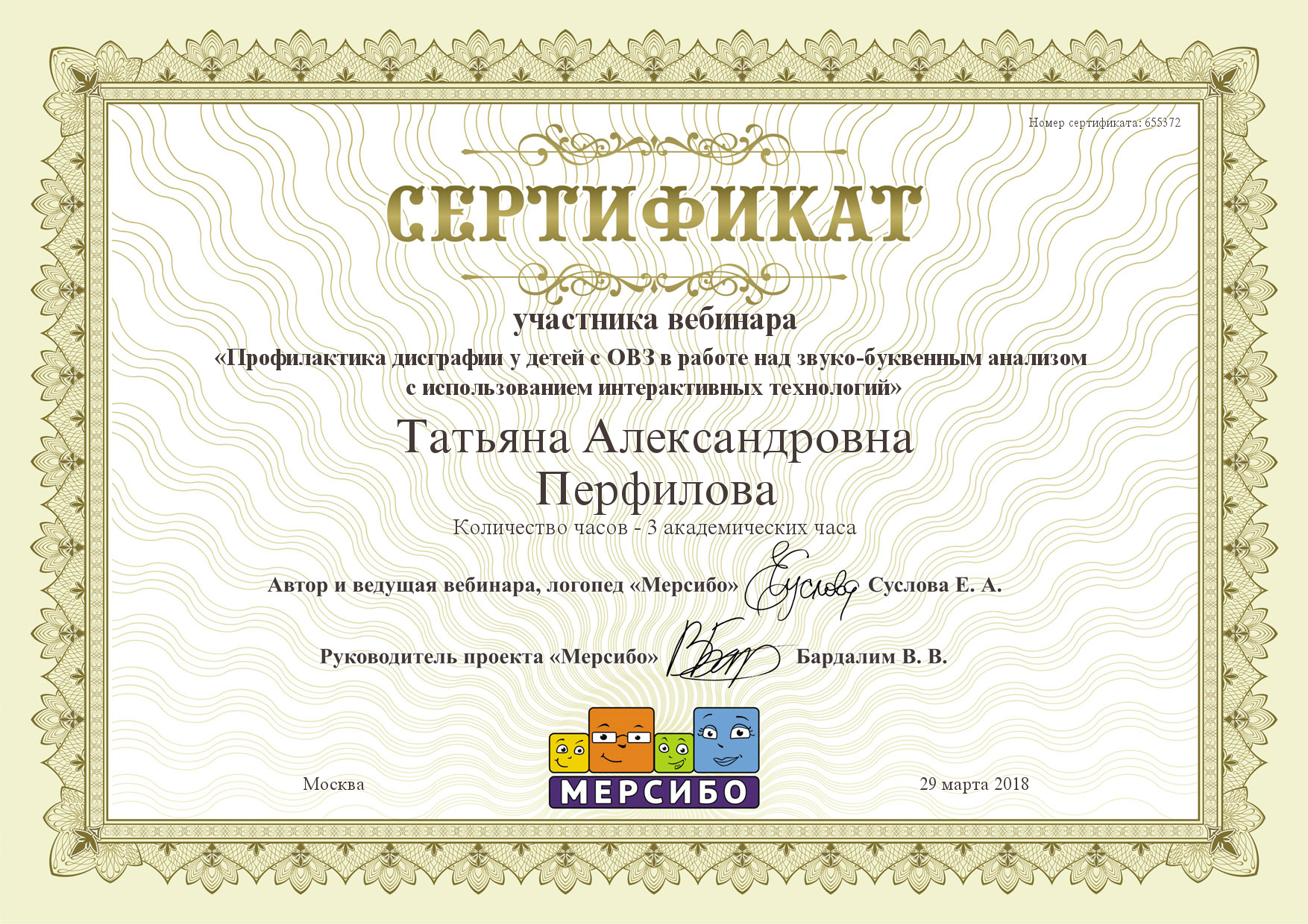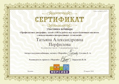 29 марта 2018 года участвовала в вебинаре на тему: «Профилактика дисграфии у детей с ОВЗ в работе над звуко-буквенным анализом с использованием интерактивных технологий», по результатам которого получила сертификат участника.