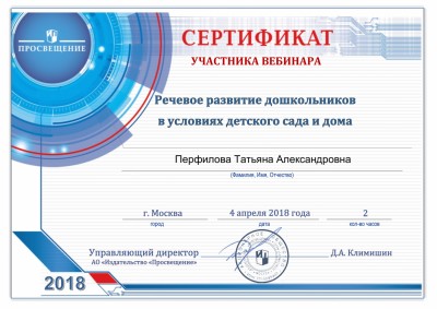 4 марта 2018 года участвовала в вебинаре на тему: "Речевое развитие дошкольников в условиях детского сада и дома", по результатам которого получила сертификат участника.