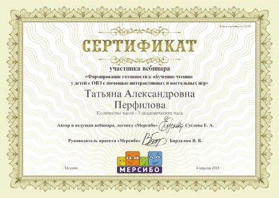 4 марта 2018 года участвовала в вебинаре на тему: «Формирование готовности к обучению чтению у детей с ОВЗ с помощью интерактивных и настольных игр».