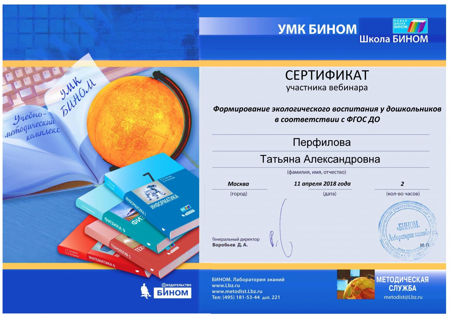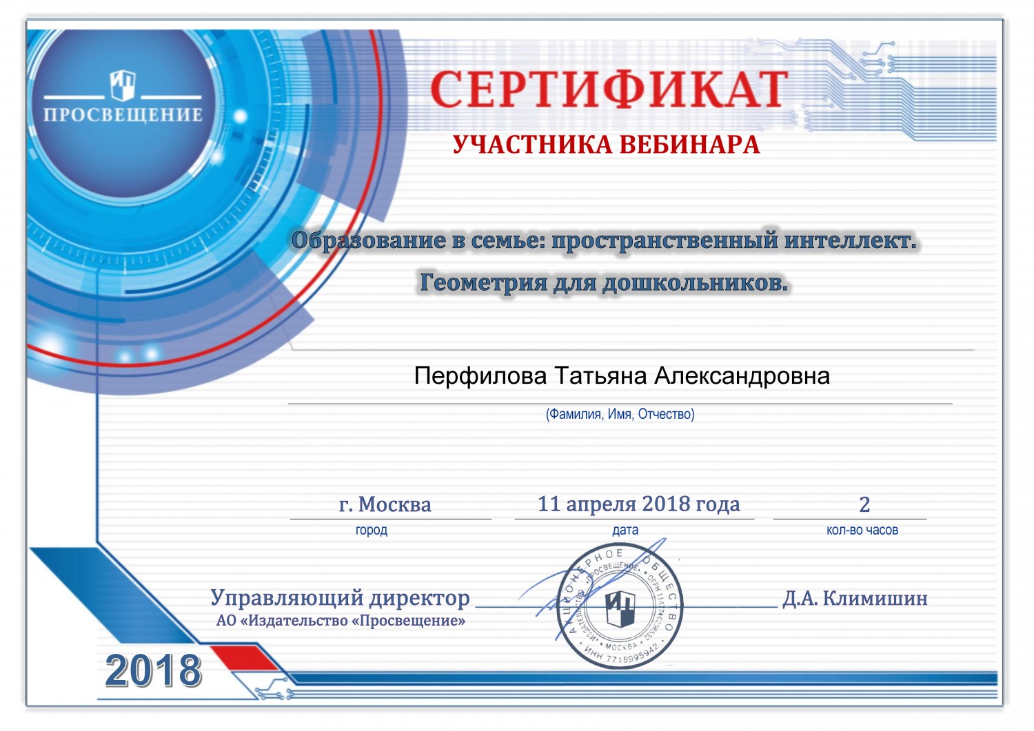 11 апреля 2018 года участвовала в вебинаре на тему: Образование в семье: пространственный интеллект. Геометрия для дошкольников", по результатам которого получила сертификат участника.