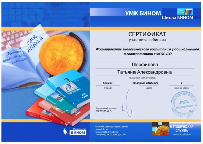 11 апреля 2018 года участвовала в вебинаре на тему: "Формирование экологического мировоззрения у дошкольников в соответствии с ФГОС ДО", по результатам которого получила сертификат участника.