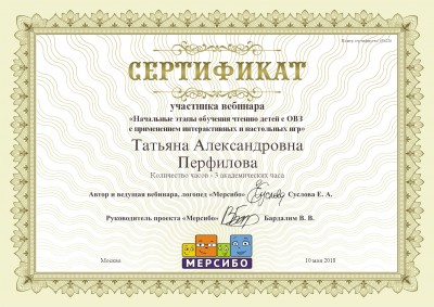 10 мая 2018 года участвовала в вебинаре на тему: «Начальные этапы обучению чтению детей с ОВЗ с применением интерактивных и настольных игр», по результатам которого получила сертификат участника.