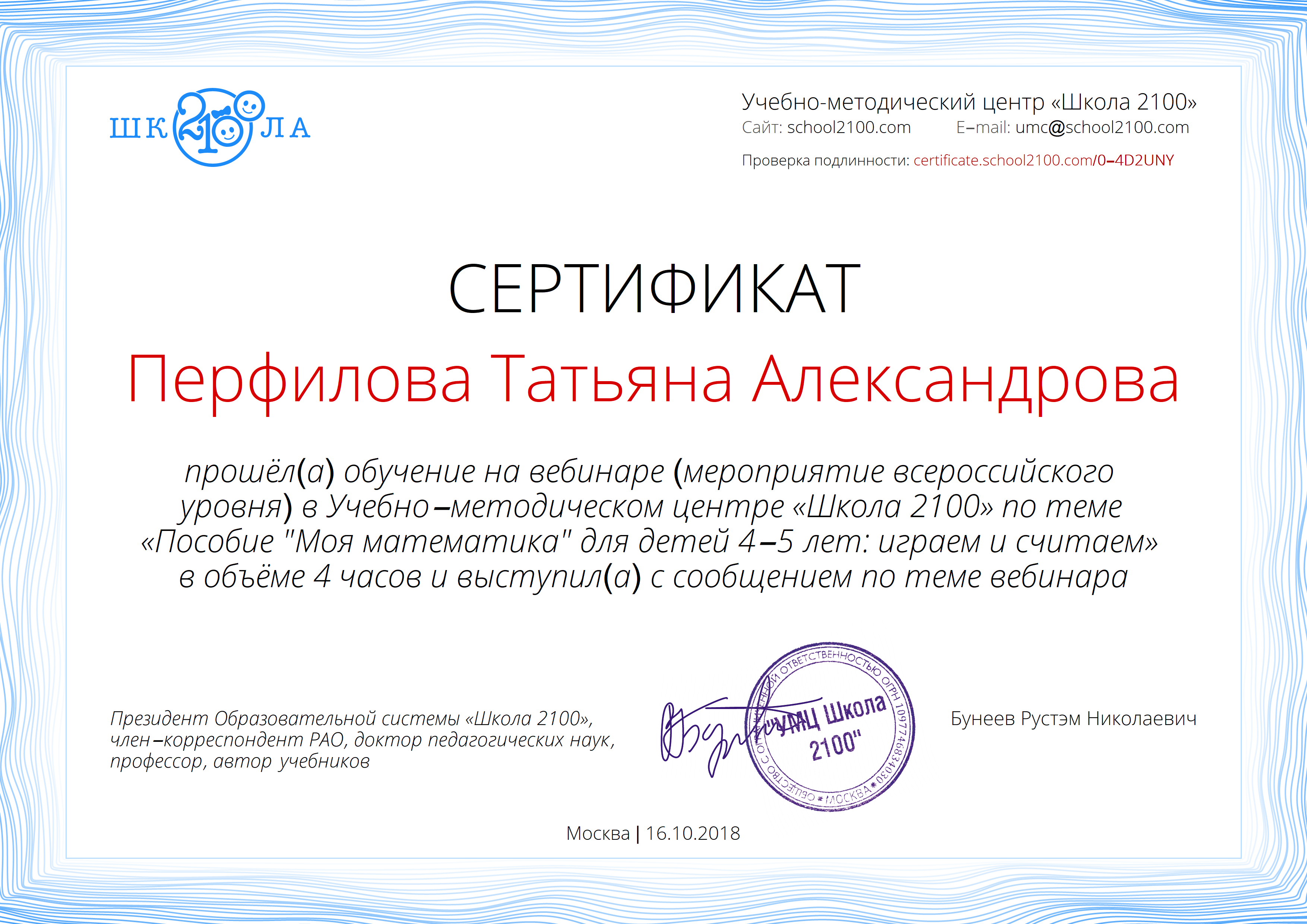 16 октября 2018 года участвовала в вебинаре на тему: «Моя математика»: играем и считаем» (работаем по пособию УМК «Детский сад 2100» «Моя математика» для детей 4-5 лет (авторы М.В. Корепанова, С.А. Козлова, О.В. Пронина).
