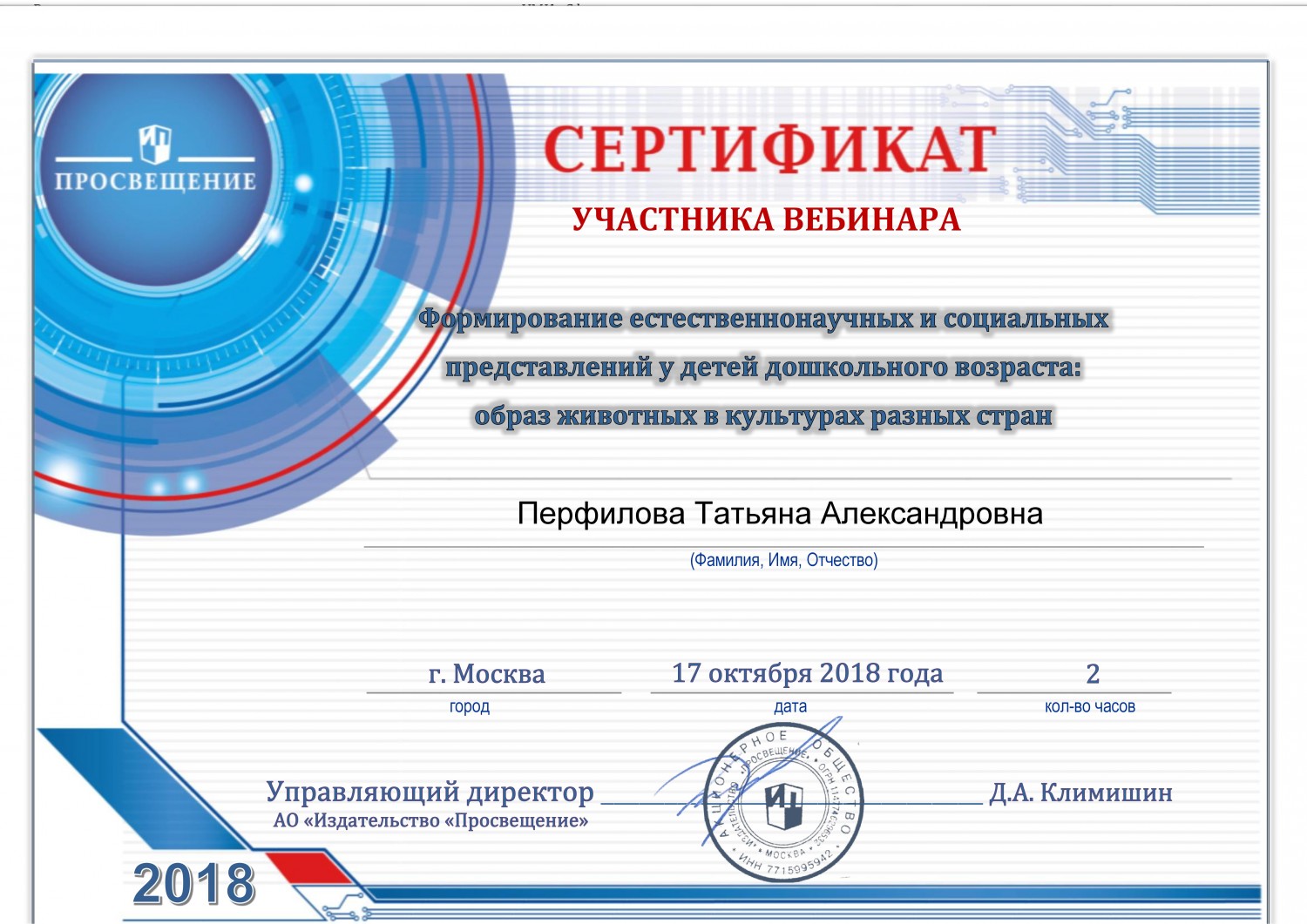 17 октября 2018 года участвовала в вебинаре на тему: "Формирование естественнонаучных и социальных представлений у детей дошкольного возраста: образ животных в культурах разных стран", по результатам которого получила сертификат участника.