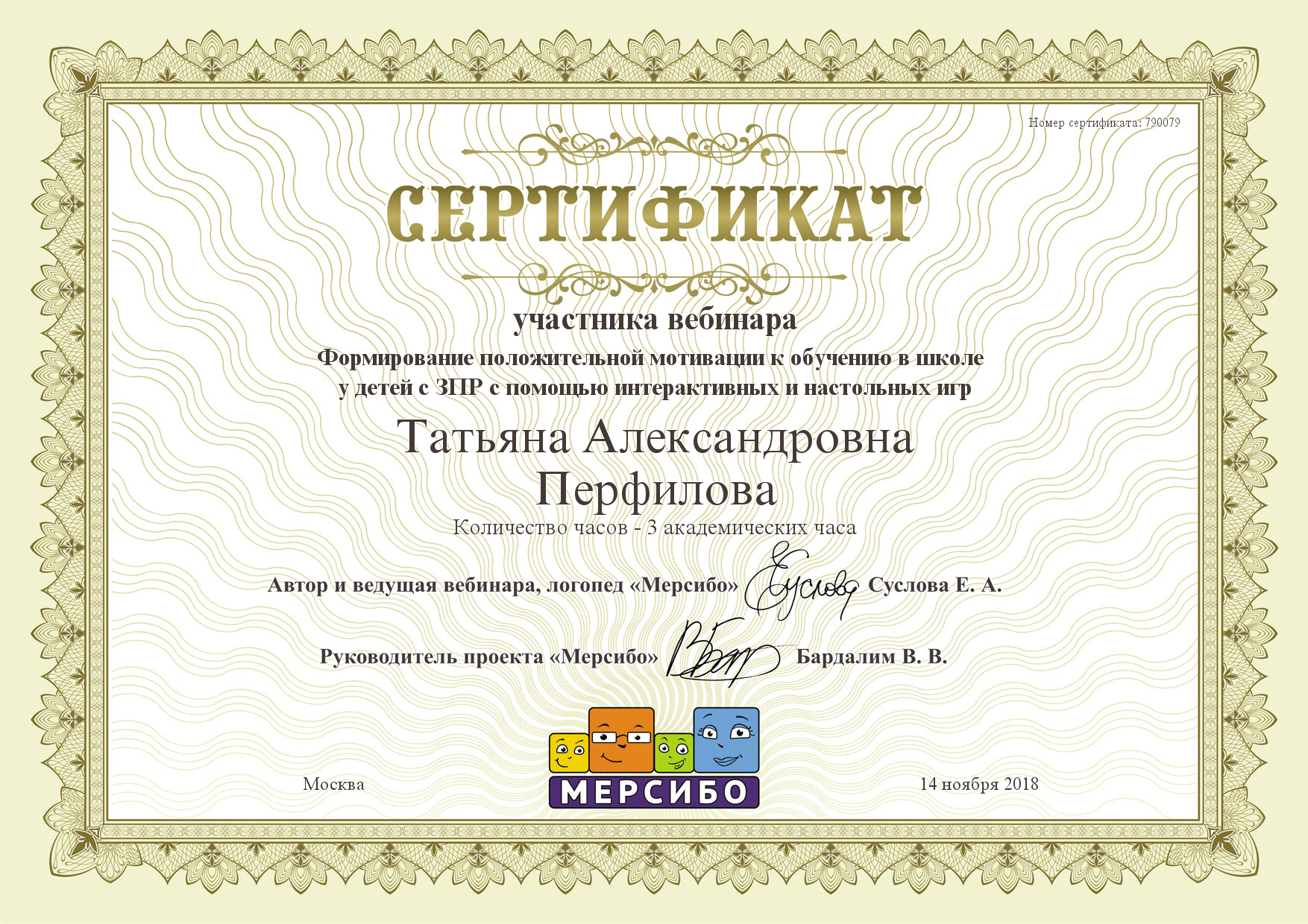 14 ноября 2018 года участвовала в вебинере на тему: «Формирование положительной мотивации к обучению в школе у детей с ЗПР с помощью интерактивных и настольных игр»