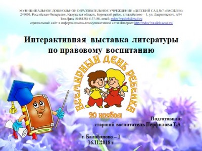 20 ноября 2018 года подготовила выступление на семинаре - практикуме "Охрана прав и достоинств маленького гражданина" для педагогов МДОУ "Детский сад №7 "Василек" в рамках Всероссийского дня правовой помощи детям в 2018 году на тему: "Интерактивная выставка литературы по правовому воспитанию".
