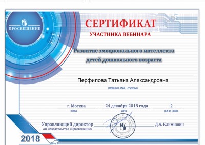24 декабря 2018 года участвовала в вебинаре на тему:"Развитие эмоционального интеллекта детей дошкольного возраста", по результатам которого получила сертификат участника.