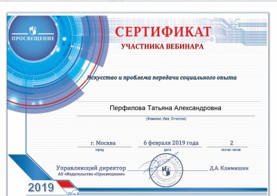 6 февраля 2019 года участвовала в вебинаре на тему: "Искусство и проблема передачи социального опыта", по результатам которого получила сертификат участника.