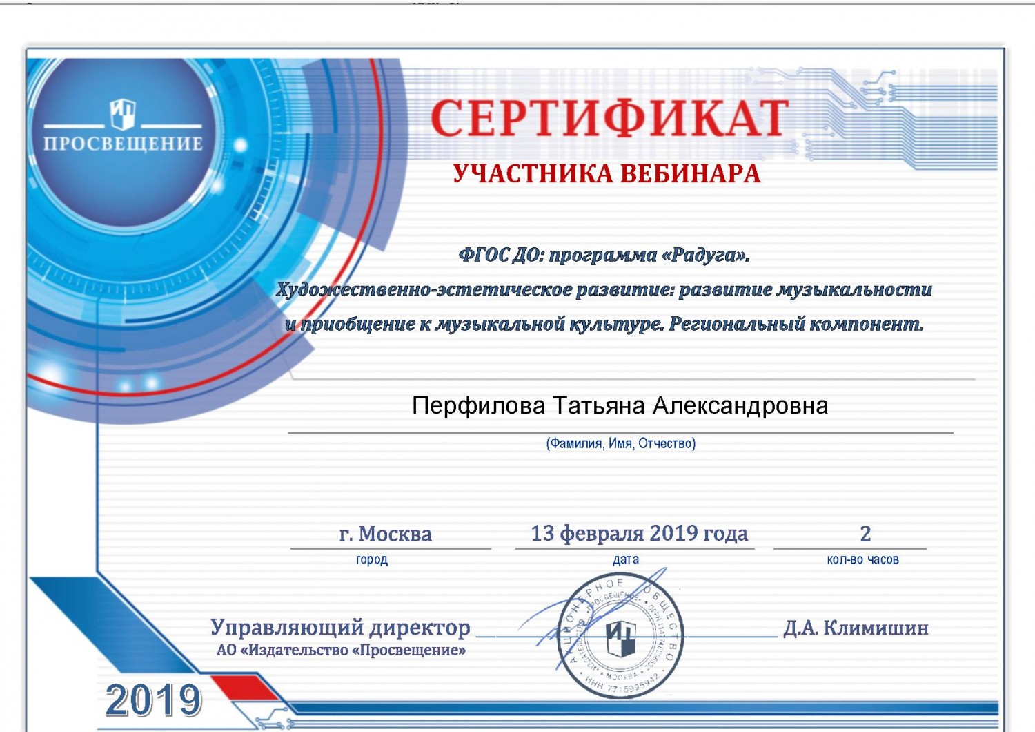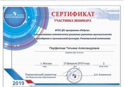 13 февраля 2019 года участвовала в вебинаре на тему: "ФГОС ДО: программа «Радуга». Художественно-эстетическое развитие: развитие музыкальности и приобщение к музыкальной культуре. Региональный компонент", по результатам которого получила сертификат участника.