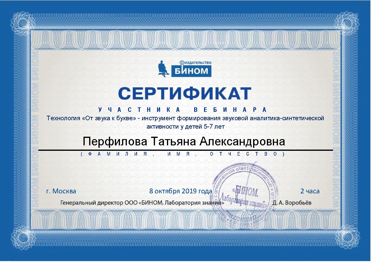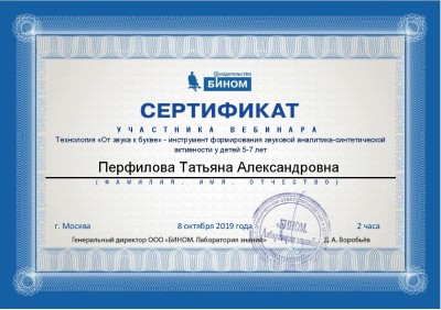 8 октября 2019 года участвовала в вебинаре на тему: "Технология «От звука к букве» - инструмент формирования звуковой аналитика-синтетической активности у детей 5-7 лет", по результатам которого получила сертификат участника.