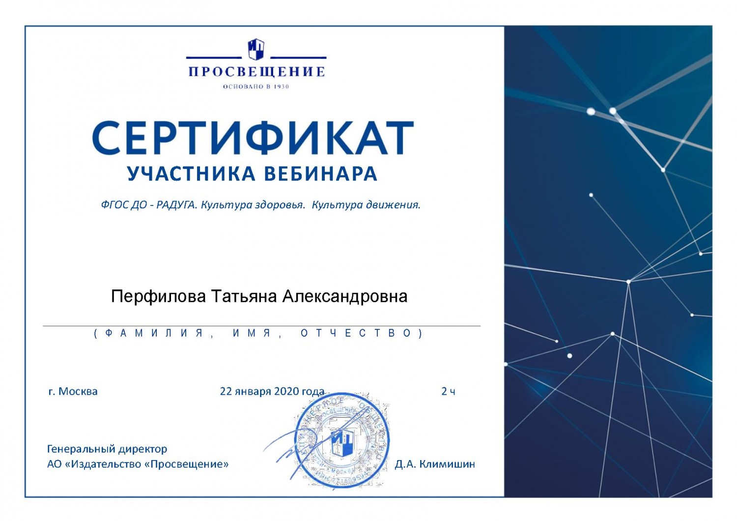 22 января 2020 года участвовала в вебинаре на тему:"ФГОС ДО - РАДУГА. Культура здоровья. Культура движения", по результатам которого получила сертификат участника.