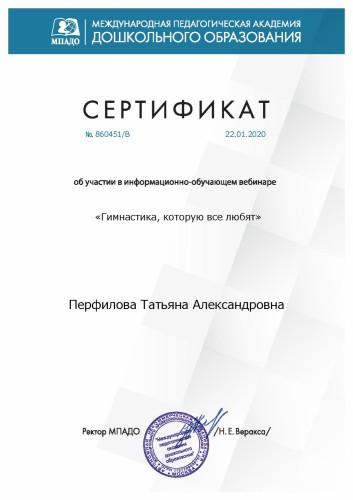 22 января 2020 года участвовала в вебинаре на тему: «Гимнастика, которую все любят», по результатам которого получила сертификат участника.