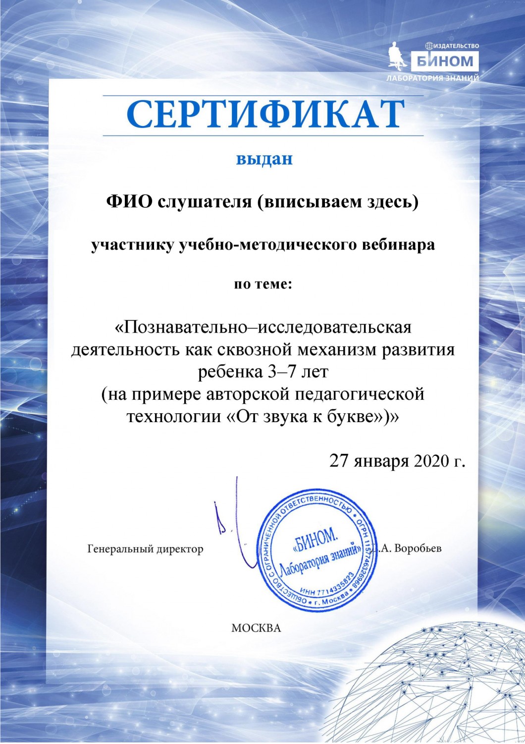 27 января 2020 года участвовала в вебинаре на тему: "Познавательно–исследовательская деятельность как сквозной механизм развития ребенка 3–7 лет" (на примере авторской педагогической технологии «От звука к букве»), по результатам которого получила сертификат участника.