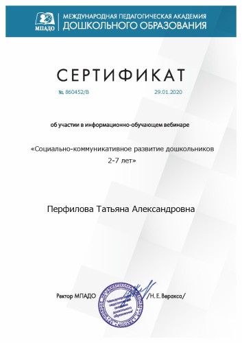 29 января 2020 года участвовала в вебинаре на тему: «Социально-коммуникативное развитие дошкольников», по результатам которого получила сертификат участника.