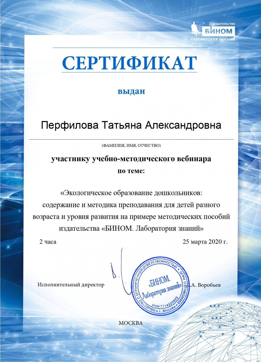 25 марта 2020 года участвовала в вебинаре на тему: "Экологическое образование дошкольников: содержание и методика преподавания для детей разного возраста и уровня развития на примере методических пособий", по результатам которого получила сертификат участника.