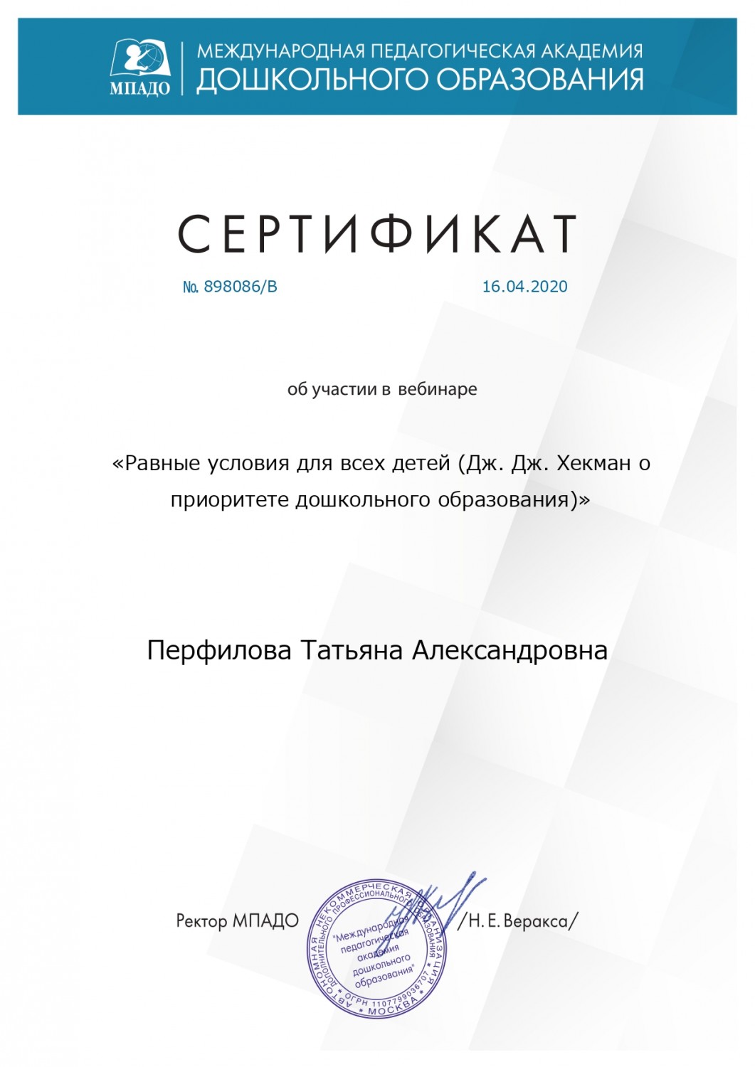 16 марта 2020 года участвовала в вебинаре на тему: "В поисках настоящего дошкольного детства".