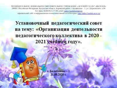 31 августа 2020 года в МДОУ "Детский сад №7 "Василек" провела установочный педагогический совет на тему: "Организация деятельности педагогического коллектива в 2020 - 2021 учебном году", в ходе которого педагогический коллектив Детского сада познакомился с планом работы на новый учебный год, с расписанием образовательной деятельности, календарным и учебным планом.