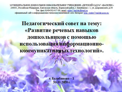 30 ноября 2020 года в МДОУ "Детский сад №7 "Василек" прошел педагогический совет на тему: "Развитие речевых навыков дошкольников с помощью использования информационно-коммуникативных технологий". На педагогическом совете выступила с сообщением по теме педсовета, что использование средств ИКТ позволяет сделать процесс обучения достаточно простым и эффективным и откроет новые возможности для дошкольного образования.