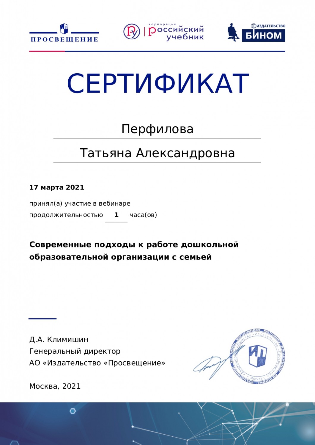 17 марта 2021 приняла участие в вебинаре на портале издательства "Просвещние" на тему: «Современные подходы к работе дошкольной образовательной организации с семьей».