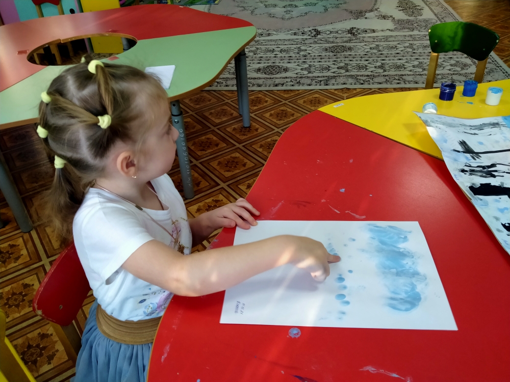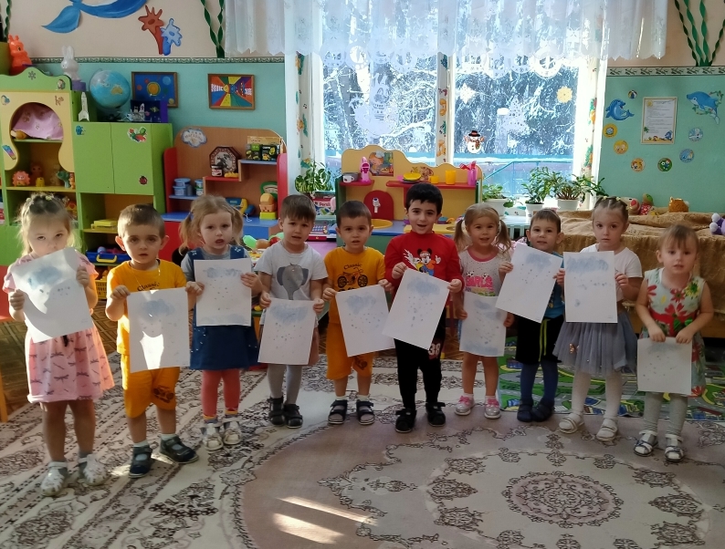 10 декабря 2021 года в рамках дополнительного образования детей провела занятие по дополнительной общеобразовательной программе "Разноцветный мир" по теме: «Первый снег из тучки». Учила наносить белую гуашь на кулачок с нижней стороны и делать отпечаток тучки. Отпечатками пальцев рисовали снег. Воспитывала эмоциональную отзывчивость к явлениям не живой природы. Получились замечательные работы.