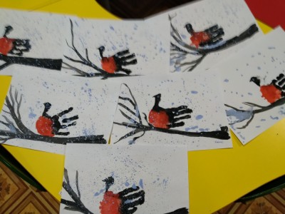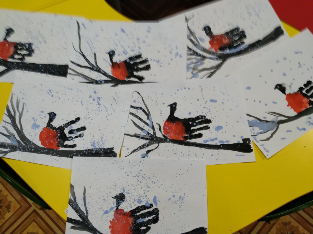 31 января 2022 года в рамках дополнительного образования детей провела занятие по дополнительной общеобразовательной программе "Разноцветный мир" по теме: «Снегирь». Учила детей с помощью отпечатка ладони рисовать птицу, добавляя в рисунок элементы. Развивала воображение и творчество.