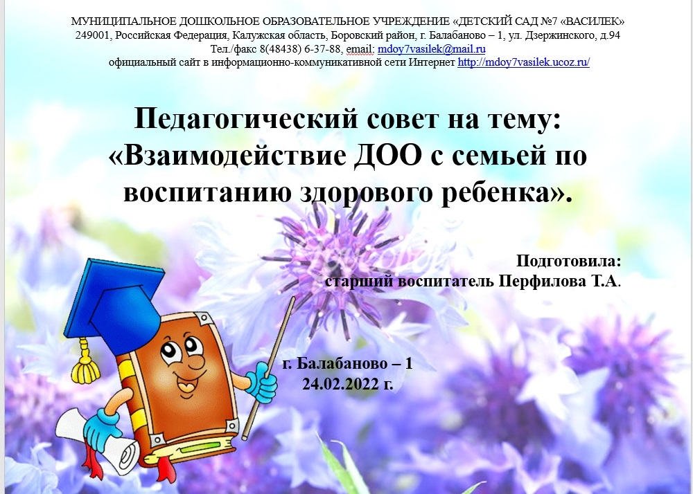24 февраля 2022 года в МДОУ "Детский сад №7 "Василек" прошел педагогический совет на тему: «Взаимодействие ДОО с семьей по воспитанию здорового ребенка».