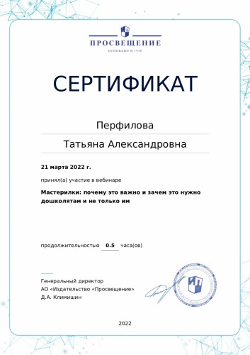 В период с 17 марта по 18 марта 2022 года прошла курс повышения квалификации для методистов и старших воспитателей "Физическое развитие дошкольников" на базе ГБОУ ДПО «Псковский областной институт повышения квалификации работников образования», который вела Григорьева Ирина Анатольевна.