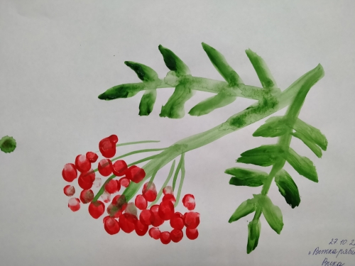 27 октября 2022 года в средней группе "Звездочки" в рамках дополнительного образования детей провела занятие по программе "Разноцветный мир" по теме: «Ветка рябины». Учила детей работать, используя навыки изобразительных средств (линия, пятно). Закрепила умение рисовать листья приемом примакивания. Познакомила детей с новым техническим приемом печатание подушечками пальцев (ягоды рябины). Развивала цветовое восприятие, моторику пальцев рук, воображение и творчество.