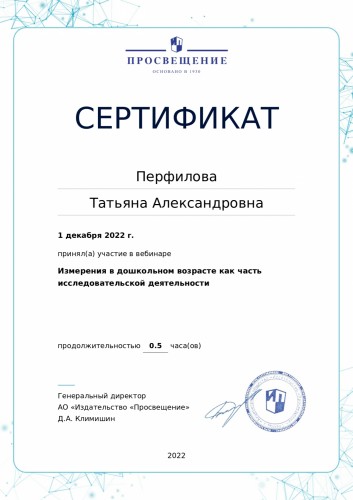 1 декабря 2022 года участвовала в вебинаре на тему: "Измерения в дошкольном возрасте как часть исследовательской деятельности".
