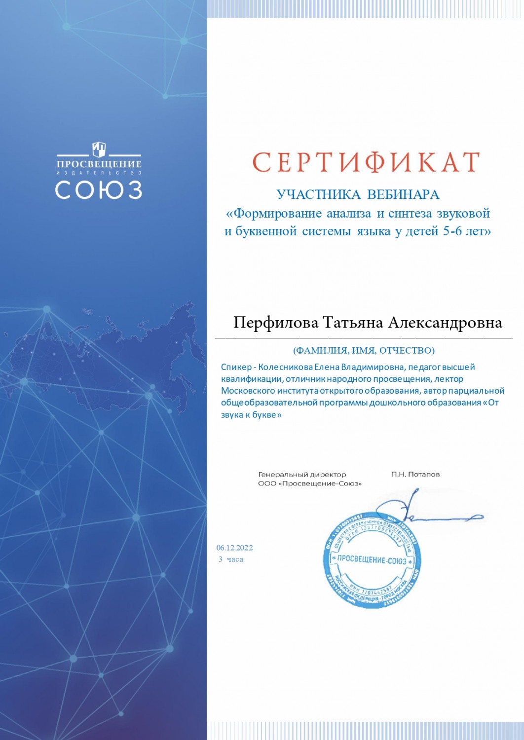 6 декабря 2022 года участвовала в вебинаре на тему: "Формирование анализа и синтеза звуковой и буквенной системы языка у детей 5-6 лет".