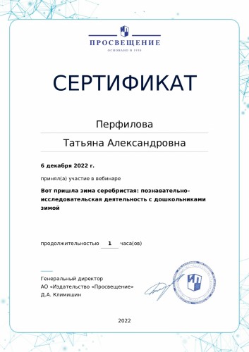 6 декабря 2022 года участвовала в вебинаре на тему: "Вот пришла зима серебристая: познавательно-исследовательская деятельность с дошкольниками зимой".