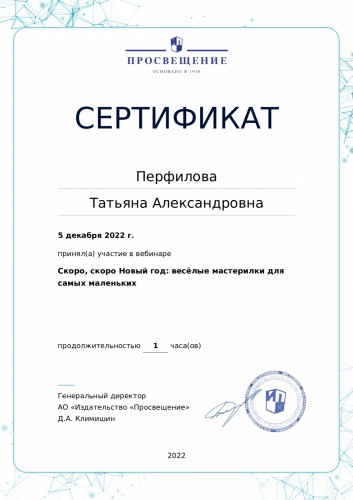 5 декабря 2022 года участвовала в вебинаре на тему: "Скоро, скоро Новый год: веселые мастерилки для самых маленьких".