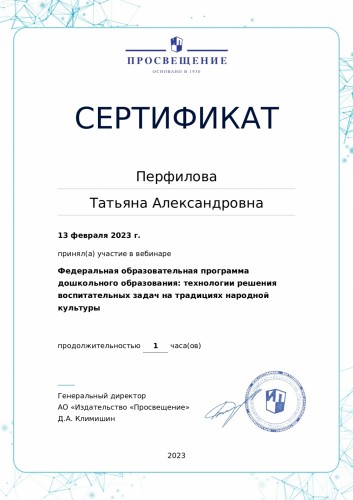 13 февраля 2023 года приняла участие в вебинаре: "Федеральная образовательная программа дошкольного образования: технологии решения воспитательных задач на традициях народной культуры".