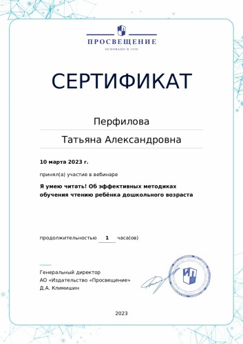 10 марта 2023 года участвовала в вебинаре "Я умею читать! Об эффективных методиках обучения чтению ребёнка дошкольного возраста".