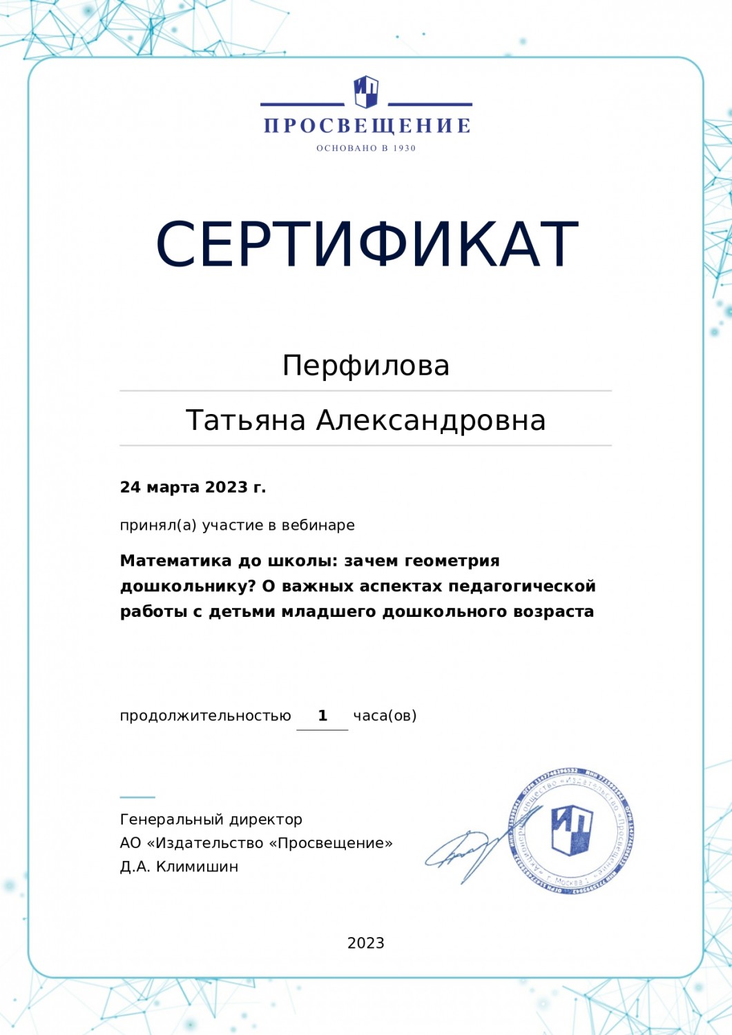24 марта 2023 года участвовала в вебинаре «Математика до школы: зачем геометрия дошкольнику? О важных аспектах педагогической работы с детьми младшего дошкольного возраста»