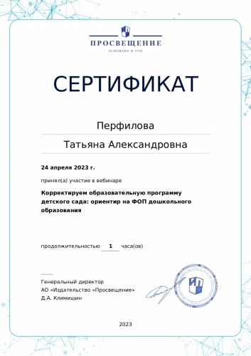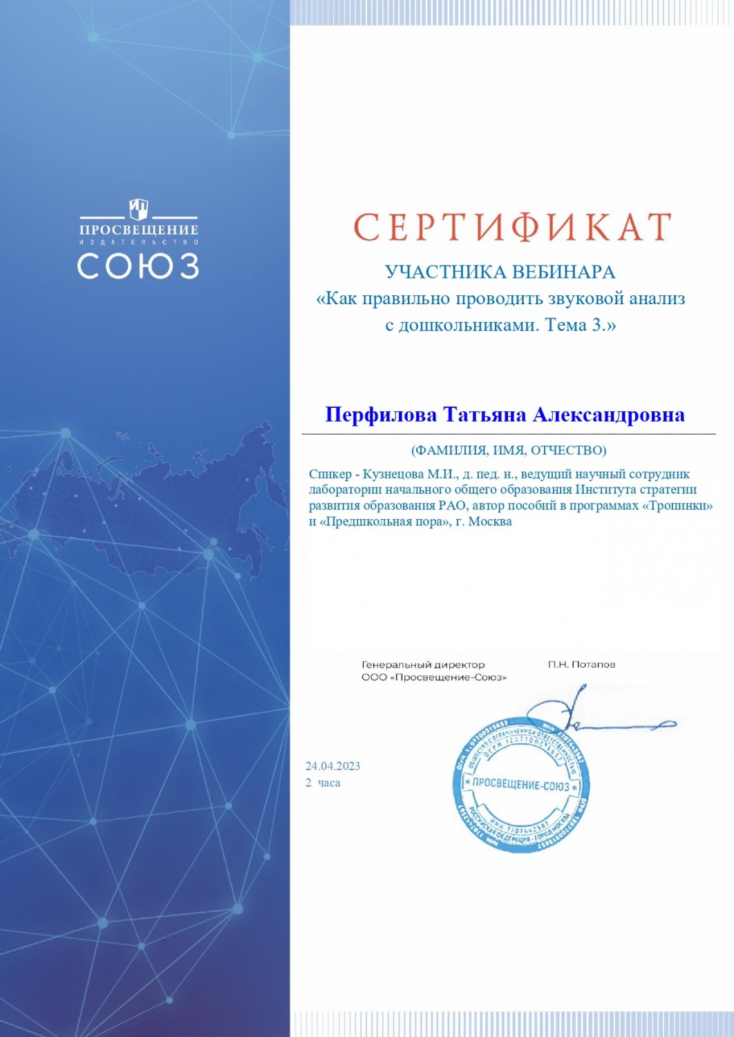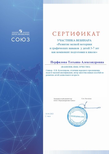 18 апреля 2023 года участвовала в вебинаре "Развитие мелкой моторики и графических навыков у детей 3-7 лет как компонент подготовки к школе".