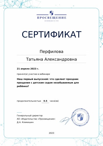 21 апреля 2023 года участвовала в вебинаре «Наш первый выпускной: что сделает праздник прощания с детским садом незабываемым для ребёнка?».