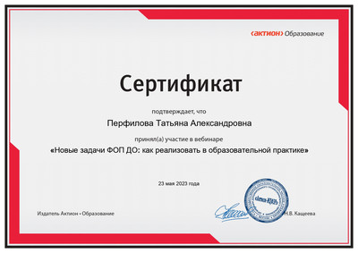 23 мая 2023 года участвовала в вебинаре «Новые задачи ФОП ДО: как реализовать в образовательной практике».