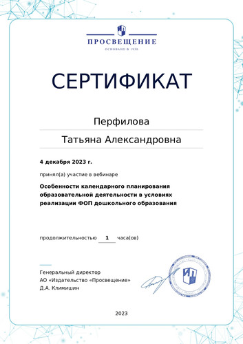 4 декабря 2023 года участвовала в вебинаре «Особенности календарного планирования образовательной деятельности в условиях реализации ФОП дошкольного образования».