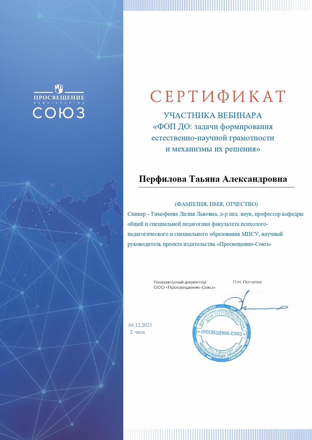 6 декабря 2023 года участвовала в вебинаре "ФОП ДО: геометрические представления детей дошкольного возраста".