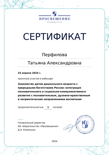 25 апреля 2024 года участвовала в вебинаре "Знакомство детей дошкольного возраста с природными богатствами России: интеграция познавательного и социально-коммуникативного развития с познавательным, духовно-нравственным и патриотическим направлениями воспитания".