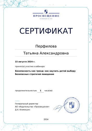 22 августа 2024 года участвовала в вебинаре "Безопасность как тренд: как научить детей выбору безопасных стратегий поведения".