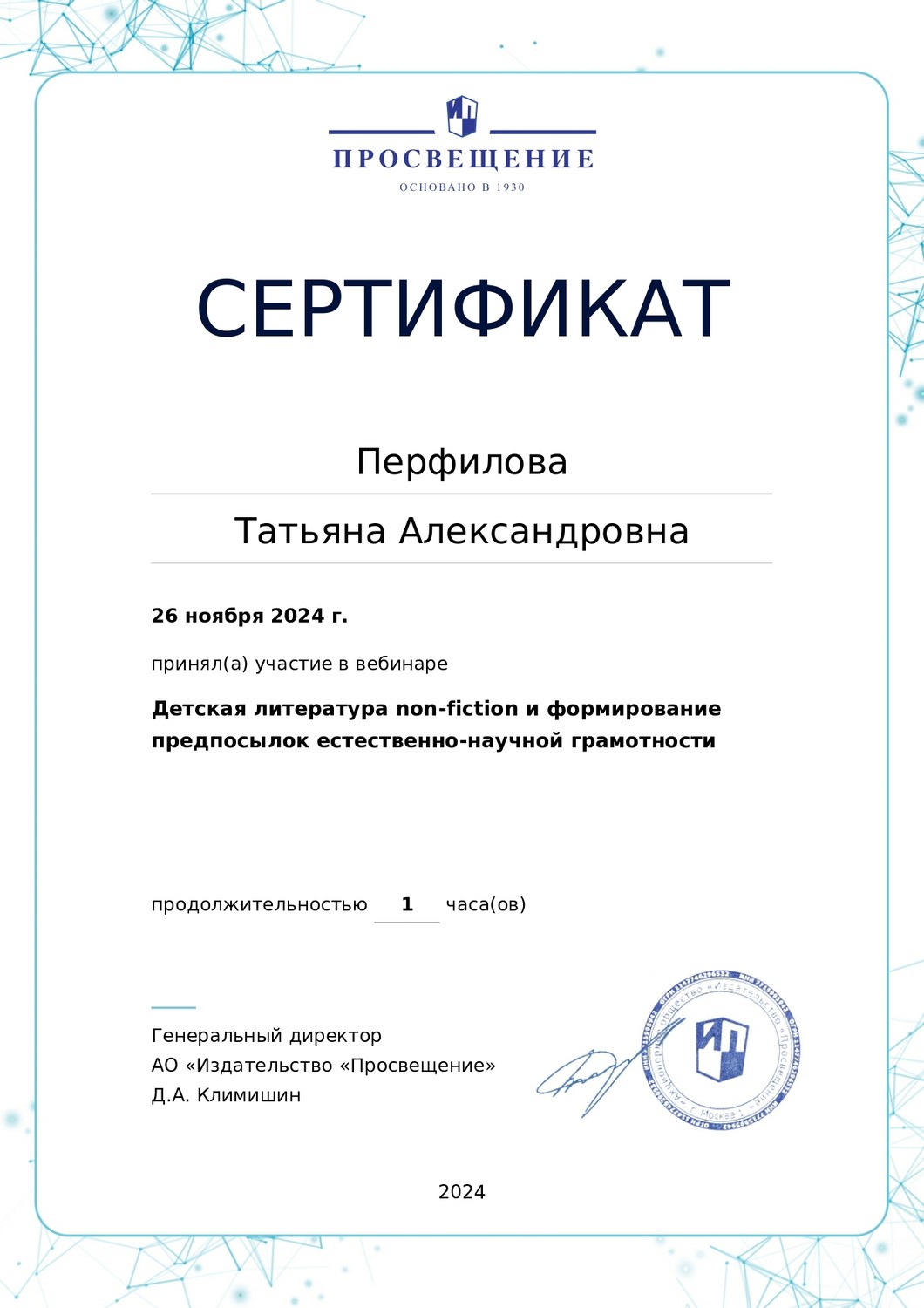 26 ноября 2024 года участвовала в вебинаре "Детская литература non-fiction и формирование предпосылок естественно-научной грамотности".