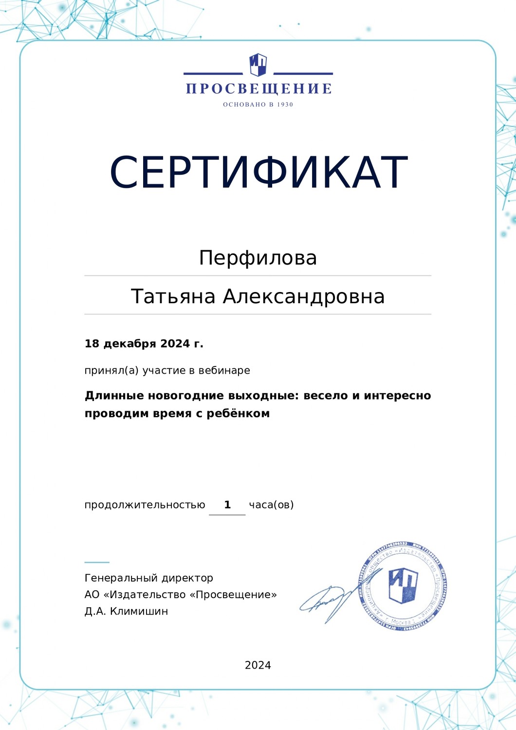 18 декабря 2024 года участвовала в вебинаре "Длинные новогодние выходные: весело и интересно проводим время с ребёнком".