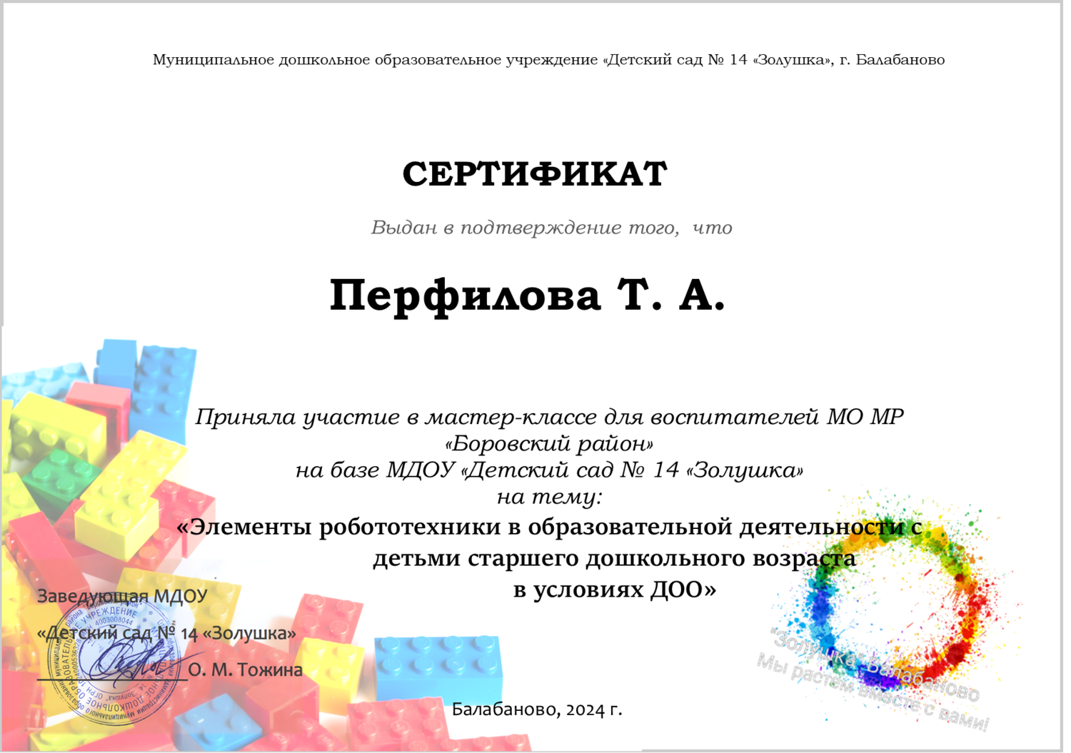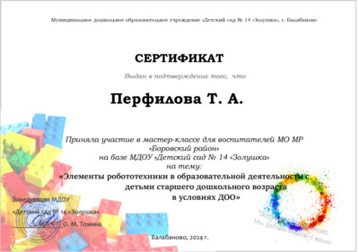 19 декабря 2024 года участвовала в мастер-класс на базе МДОУ "Детский сад № 14 "Золушка" тему «Элементы робототехники в образовательной деятельности с детьми старшего дошкольного возраста в условиях дошкольной образовательной организации».