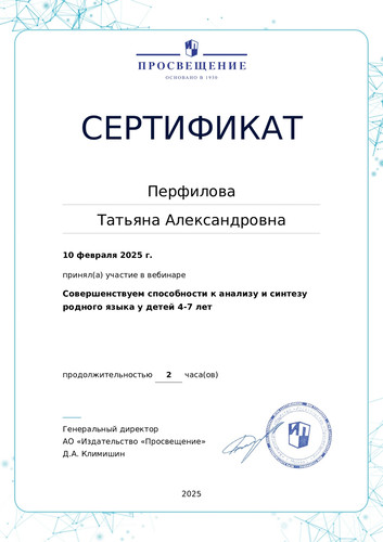 10 февраля 2025 года участвовала в вебинаре "Совершенствуем способности к анализу и синтезу родного языка у детей 4-7 лет".