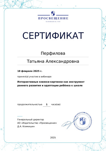18 февраля 2025 года участвовала в вебинаре "Интерактивные книжки-картинки как инструмент раннего развития и адаптации ребёнка к школе".