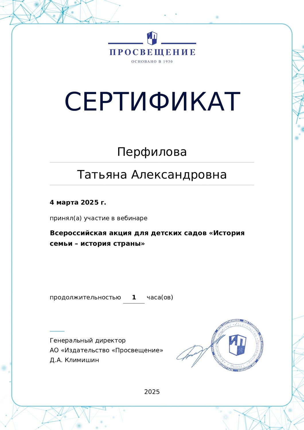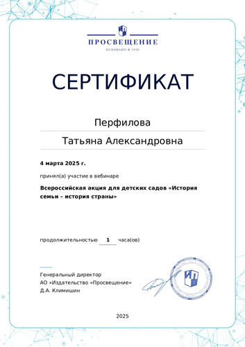 4 марта 2025 года участвовала в вебинаре "Всероссийская акция для детских садов «История семьи – история страны»".