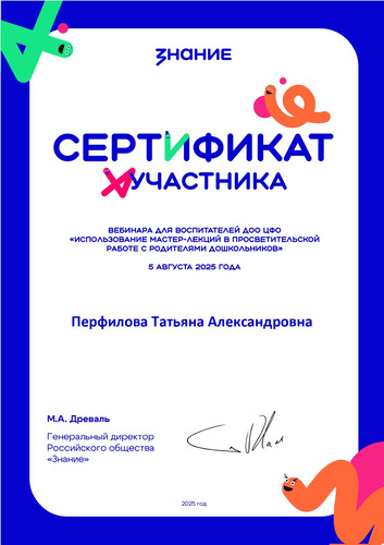 19 августа 2025 года участвовала в вебинаре "Просто детский сад! Играю и учусь говорить правильно".