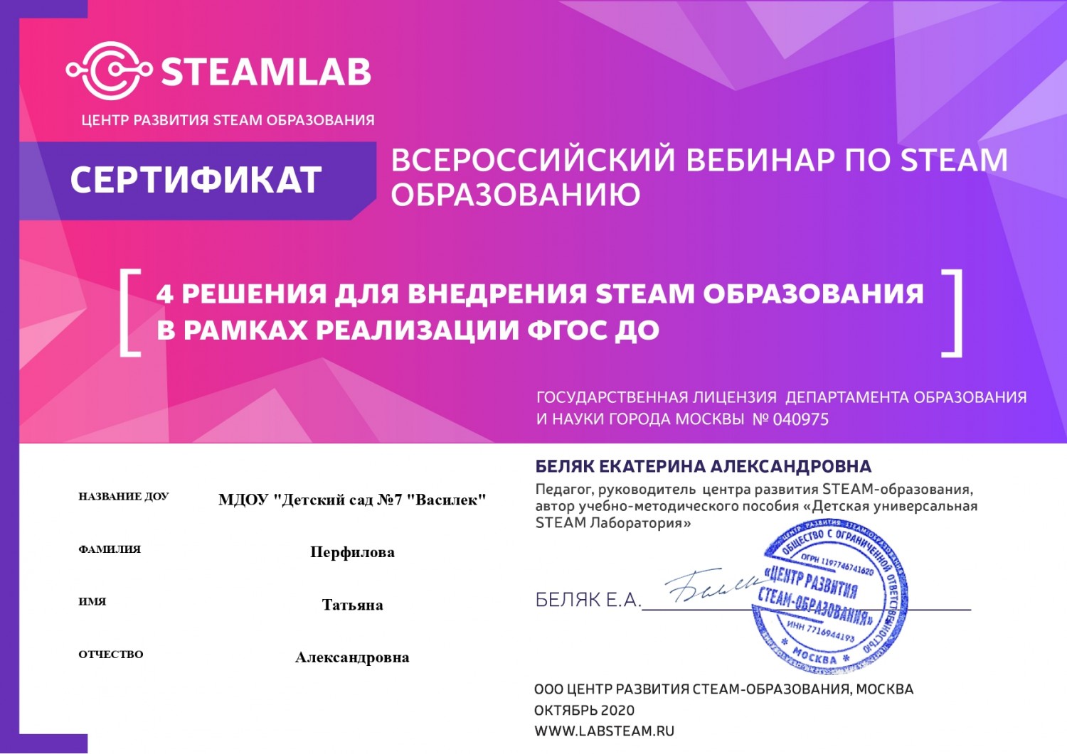 Персональный сайт старшего воспитателя Перфиловой Татьяны Александровны